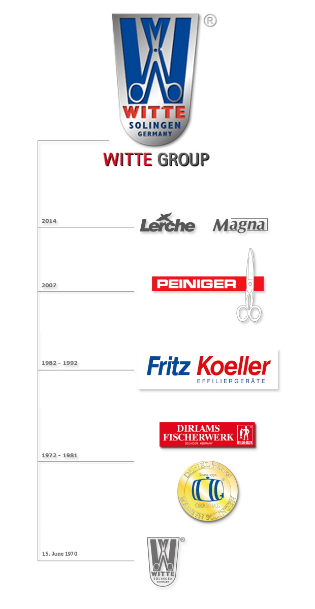 2014Purchase of the brands Lerche and Magna under Peiniger. Movement within Solingen to the new location "Beethovenstraße 183". 2007Takeover of Peiniger GmbH with FLIG. 2006Developement and production of hair knife Click `n Cut with patented blade system. 2001Innovative new product development in the field of high-quality hairdressing scissors like the EX 1, the first hairdressing scissors with an "active cut". 1999/2000Successful Marketplacement of Millennium-Series in the categories "Hair + Pet" as premiumline. 1997/98Fusion of the companies K.R. Witte and Daniel Peres; Implementation of newest Computer-technologies in production and organisation; Intensification of the fields research and development, such as qualityassurance and -management .1994Integration of the division "PET-Scissors" and beginning of the development of market leadership. 1982 - 1992Acquisition of the company Fritz Koeller (Kismet-Thinnigtool) and Fischerwerk; Rationalisation and reorganisation; Reactivation of the Labels. 1972 - 1981Assumption of the companies Dirlams and Daniel Peres and centralisation of the headquarters; Worlwide established labelmanufacturer for hairdressing-scissors. 15. Juni 1970Foundation of the sole proprietorship Kurt - Reiner Witte, Solingen 1792In 1792 DANIEL PERES - Founder of one of the oldest industrial cutlery factories - put the foundation for a global enterprise in Solingen. Innovation, quality and trade skills are the success determining factors. |
